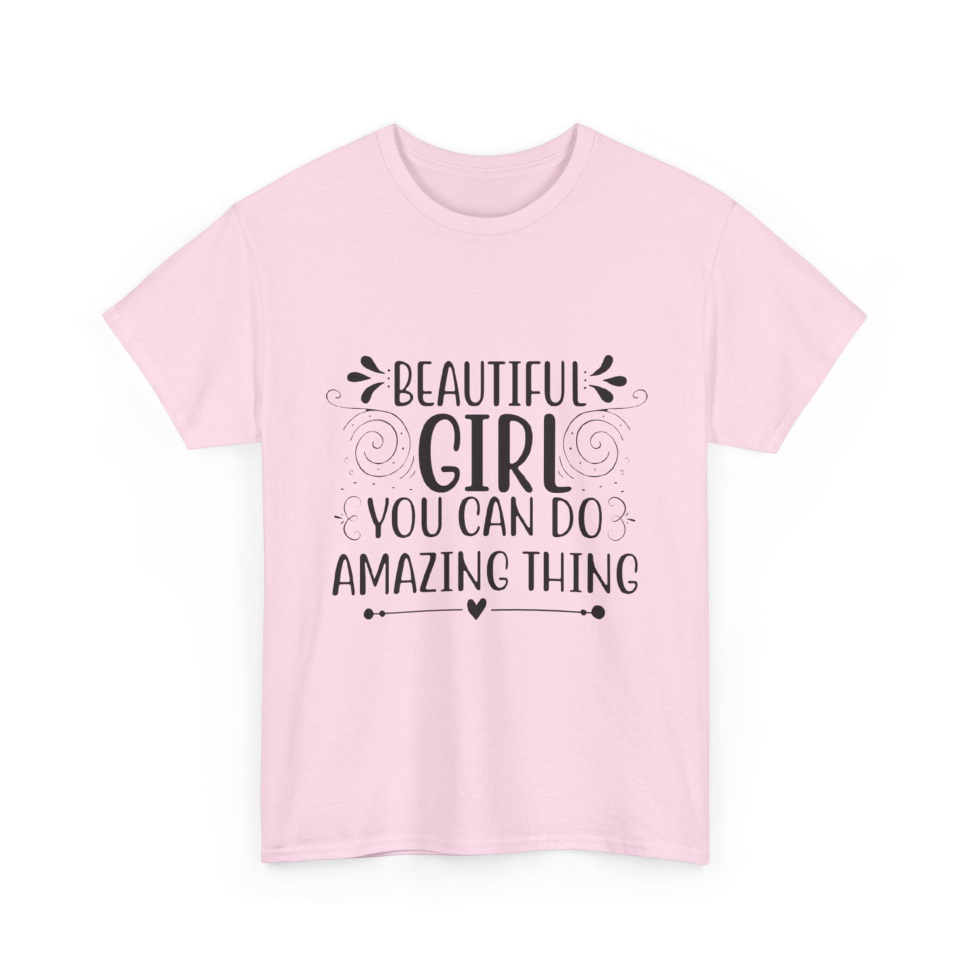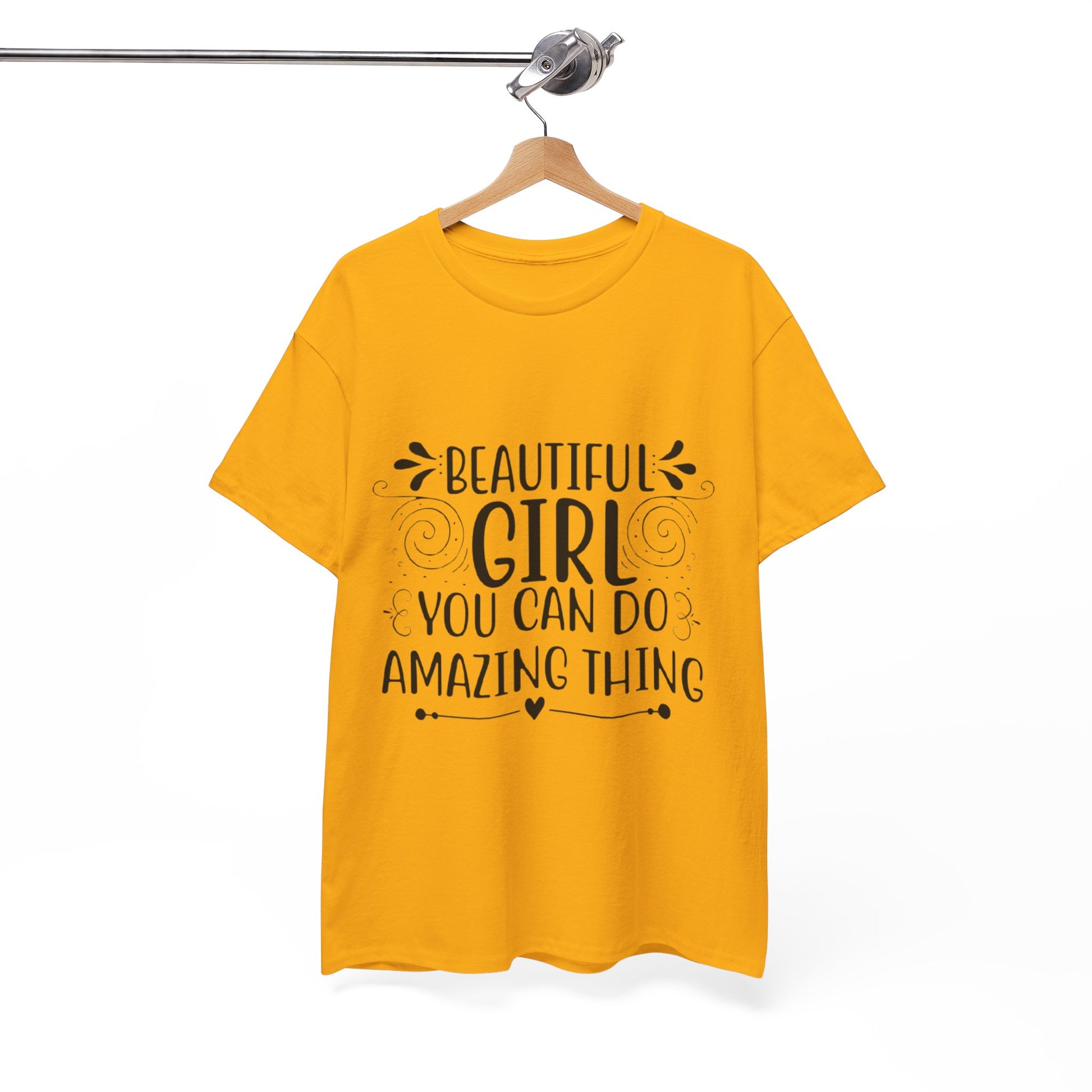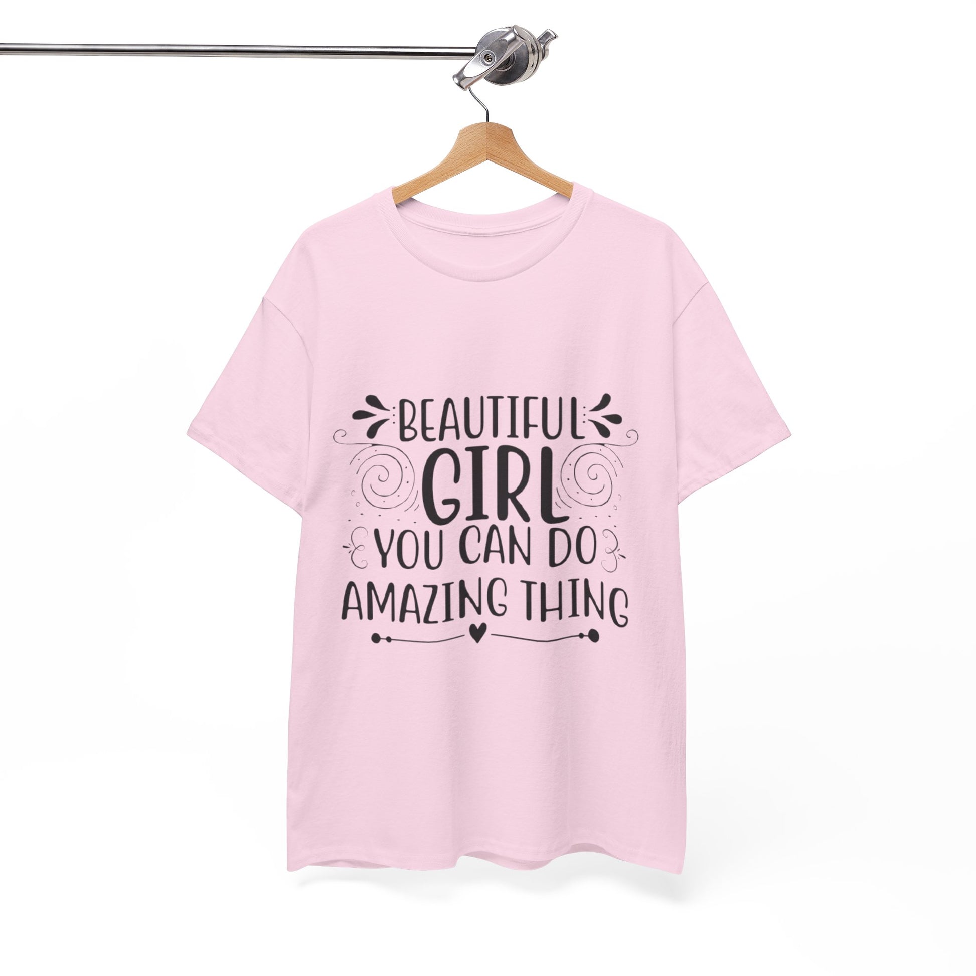 Celebrate individuality and empowerment with this Unisex Heavy Cotton Tee. The uplifting message, "Beautiful Girl, You Can Do Amazing Things," is perfect for anyone looking to express their confidence and inspiration. This tee not only brings a positive vibe but also serves as a great casual staple for everyday wear. It's suitable for various occasions like birthdays, graduations, International Women's Day, or just as a thoughtful gift to a friend or loved one. The relaxed fit and classic crew neckline make it easy to pair with jeans, skirts, or shorts for a laid-back yet stylish look.